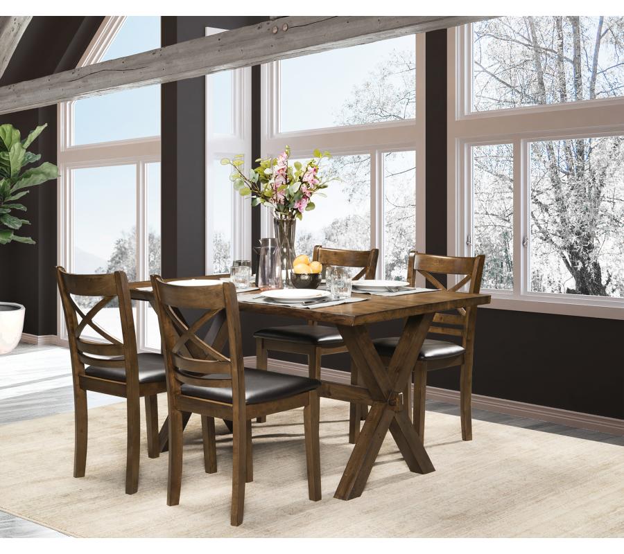 The Adalie 5 piece dining set is the perfect blend of classic style meeting rustic. It has a classic brown live edge rectangular table. Four chairs have black cushioned seats with a matching x back to the table end supports. The Adalie is the perfect table to add rustic charm to any space.