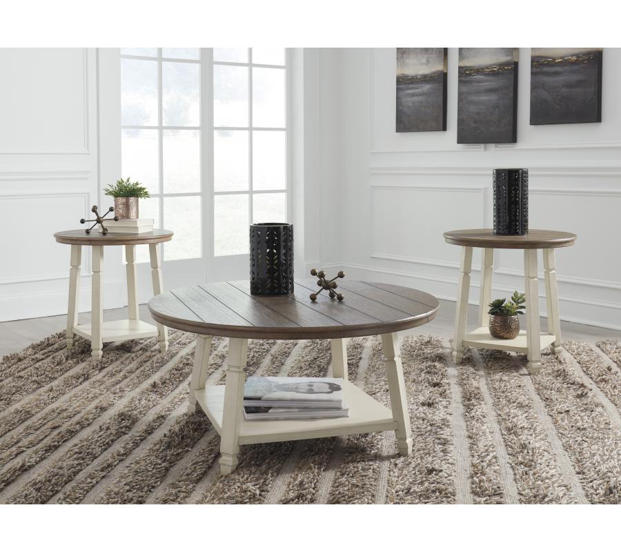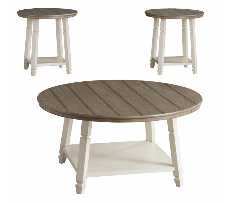 Round up country chic style for your living room repertoire with this occasional table set. Its round coffee table and two round end tables are in a popular two-tone finish that works great with the set's casual farmhouse design. Antique white bathes the lower shelves and turned legs, while a weathered oak color covers the top with planked look. The lower shelves can be used for displaying accents or open storage—what a brilliant touch.