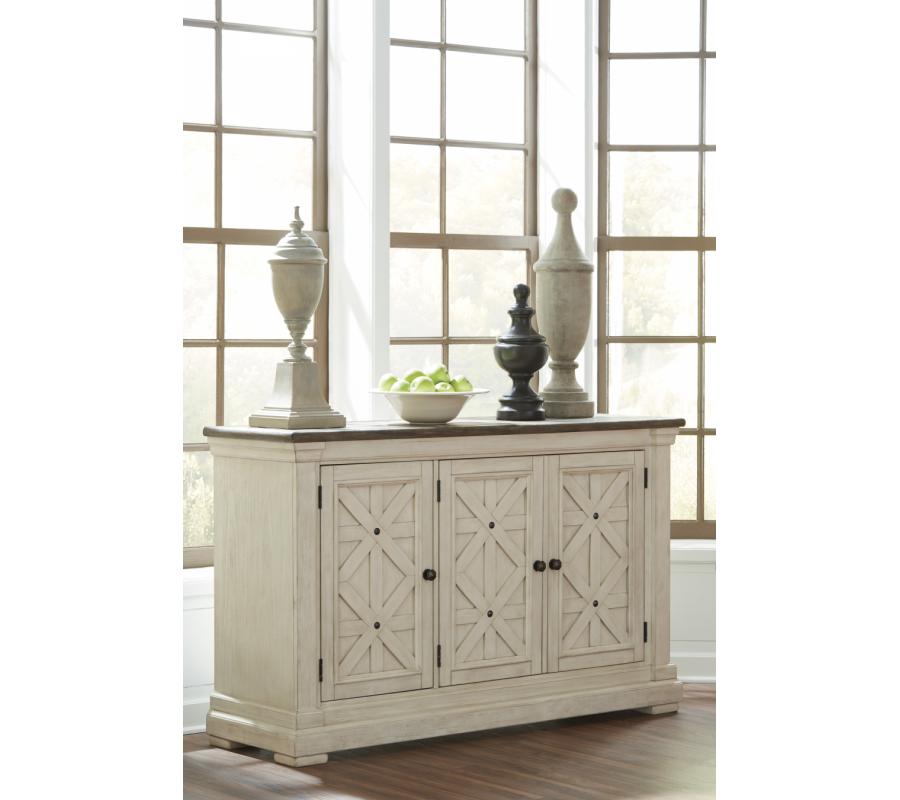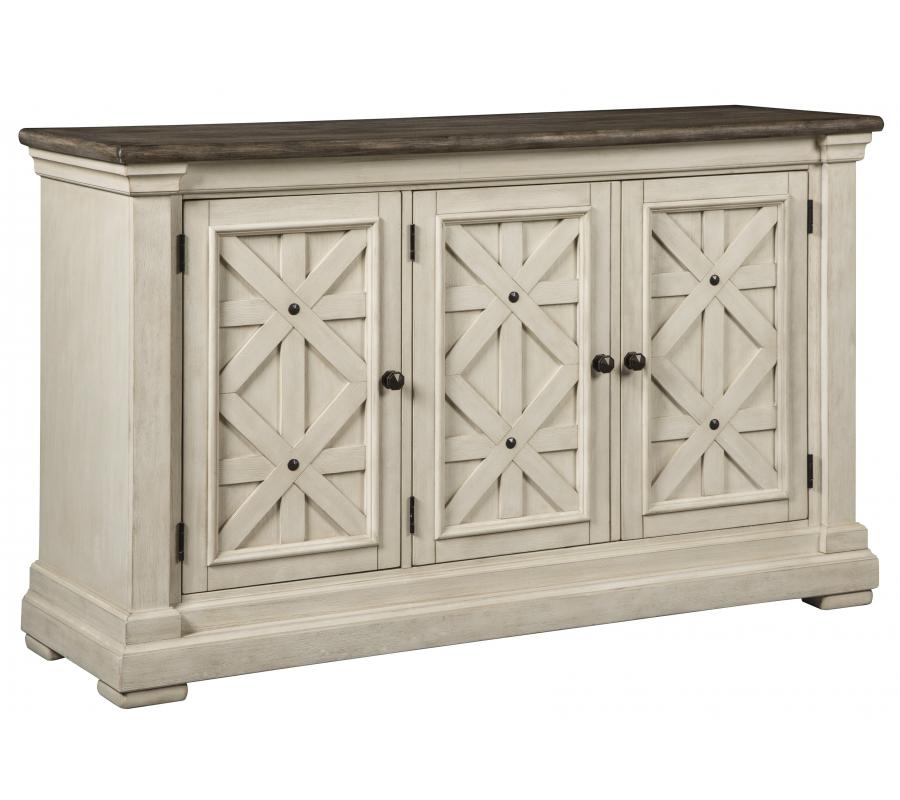 Need a stylish space to store dinnerware and all your dining room essentials? The Bolanburg server is a dream come true with four adjustable shelves that offer large capacity and a spacious top that's perfect for setting a buffet. Embellished with the casual appeal of three latticed doors, an attractive planked top with weathered oak finish and a lightly distressed white finish throughout, this vintage look will serve up elegance for years to come.