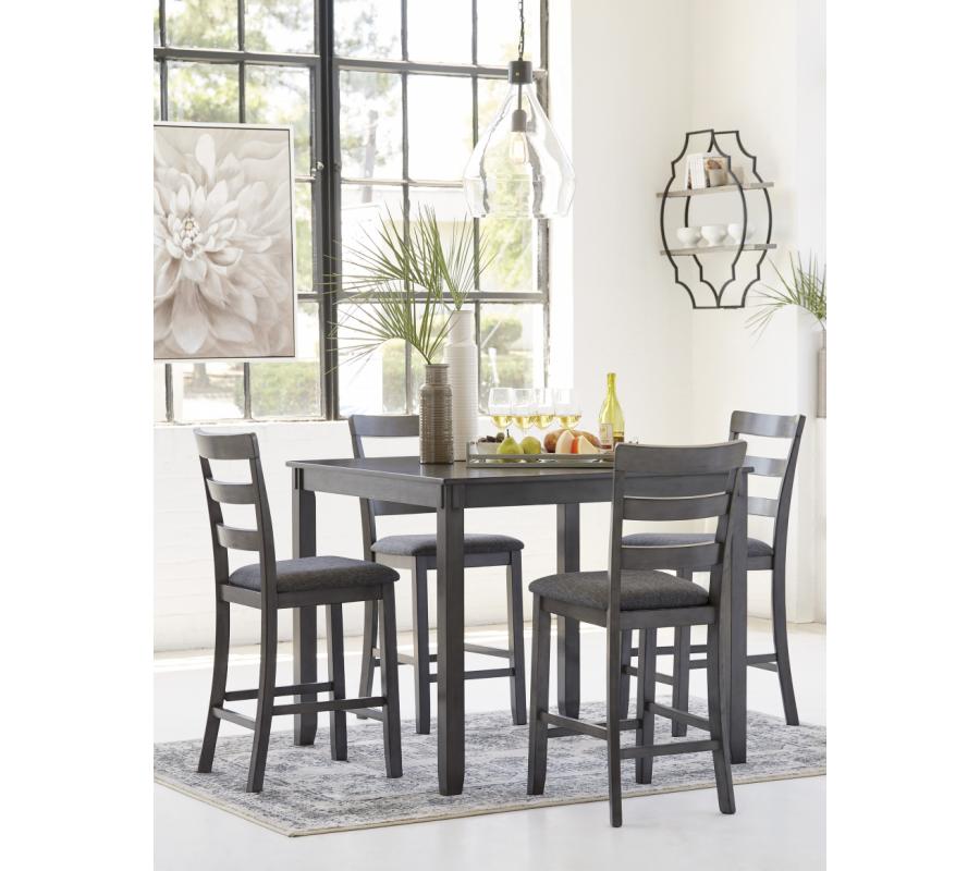 It’s so easy being gray—at least this 5-piece dining set makes it seem that way. This transitional counter-height table and barstool ensemble sports a charcoal gray finish with textured gray upholstery for an on-trend and relevant appeal. Plushly upholstered seat cushion in a practical polyfiber makes it a pleasure to linger at the table. Best of all, square table design is ideally suited for small spaces.