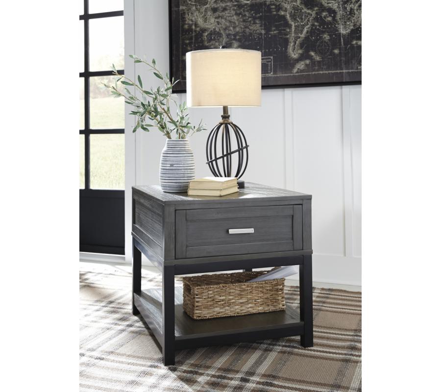 A relaxed take on modern style. This end table strikes a simply chic pose with a casually cool sensibility. Smooth-gliding drawer and convenient open shelf keep chairside necessities close at hand. Two tone finish combination of grayish brown and black metallic colors for a contemporary design. Drawer boxes are fully finished with ball bearing glides. Lift top table has fully finished interior. Satin nickel colored handles on drawer fronts.