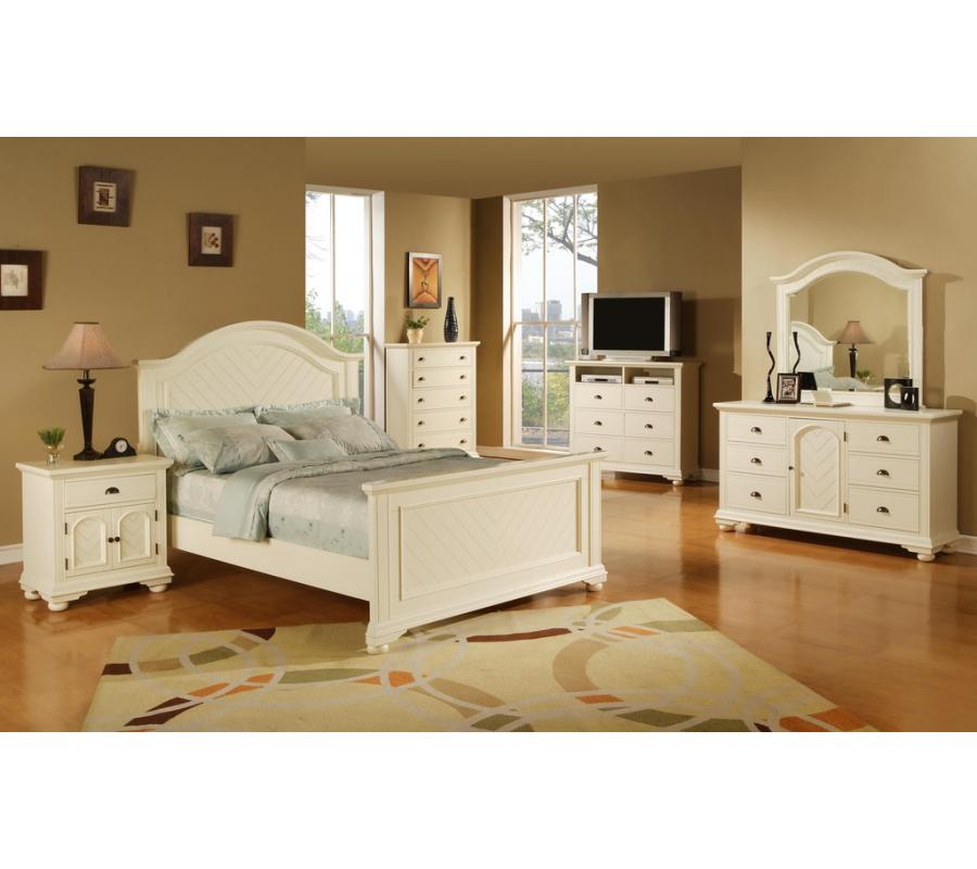 The dainty Canton White bedroom set features solid wood framing with a white top coat and a smooth lacquer finish. Beautiful design elements such as the “V” shaped wood accents throughout the set, hooded cap rails, and perfectly charming bun feet create a one of a kind look. The nightstand and dresser have cabinet style compartments for odd or oversized items. Dark coffee finished pulls and knobs complete the look of the unique look of this set.