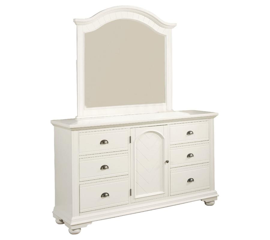 The dainty Canton White bedroom set features solid wood framing with a white top coat and a smooth lacquer finish. Beautiful design elements such as the “V” shaped wood accents throughout the set, hooded cap rails, and perfectly charming bun feet create a one of a kind look. The nightstand and dresser have cabinet style compartments for odd or oversized items. Dark coffee finished pulls and knobs complete the look of the unique look of this set.