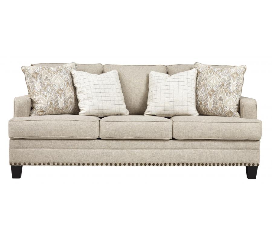 A case of contemporary and classic style influences coming together in a beautiful way, this sofa in beige brings a fresh perspective to modern farmhouse living. Distinctive elements include t-cushions that wrap around setback track arms, nailhead trim and a lovely linen-weave upholstery for an up-to-date feel. Muted hue designer throw pillows master the art of subtlety.