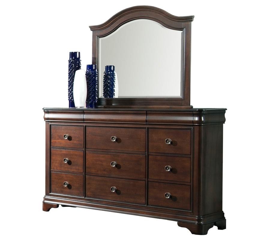 Sophisticated style meets function with the refined Cameron ensemble. Overhang case piece tops speaks to the craftsmanship of this collection while large sturdy pieces ensure this set’s durability. Hidden push out drawers on all case pieces offer easy, yet discrete storage of your more personal belongings. An elegantly arched dresser mirror is the final touch in this dashing collection.