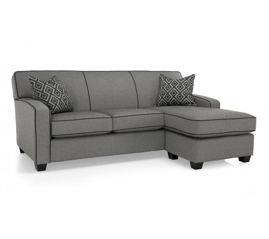 A case of contemporary and classic style influences coming together in a beautiful way, this sofa chaise in dark grey brings a classic sleek look to your living room. With its attached seamless back cushions and flat arm rests it is a lovely clean cut piece. Distinctive elements include durable fabric, padded arm rests, and a moveable chaise which allows the chaise to be on either side. Two toss cushions come with this sofa chaise that add warmth and texture to any living room.
