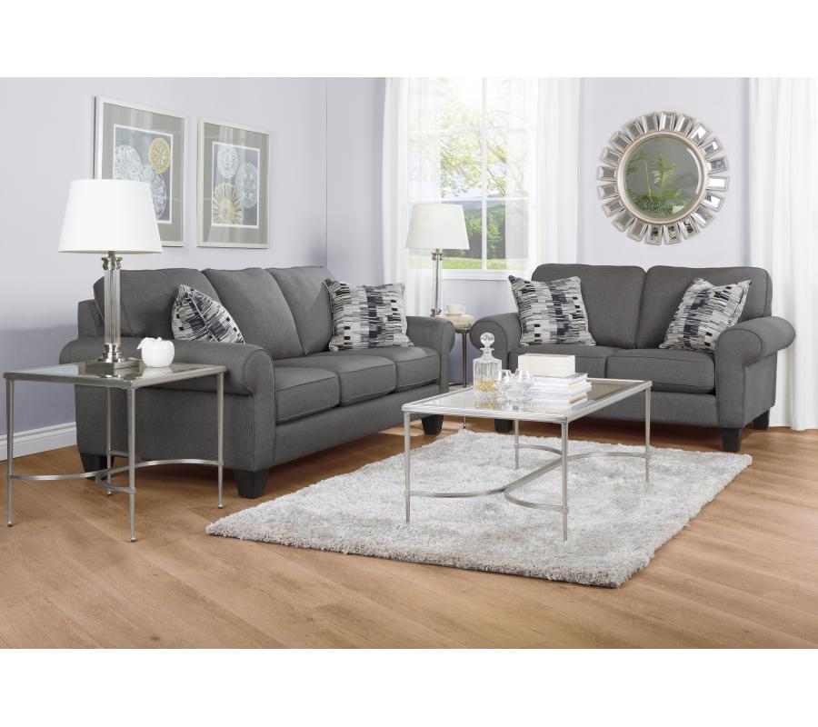 A case of contemporary and classic style influences coming together in a beautiful way, this sofa in dark brownish grey brings a classic sleek look to your living room. Distinctive elements include durable fabric, padded arm rests, and discreet black block feet. Two toss cushions come with this sofa to add texture and colour to any living room.