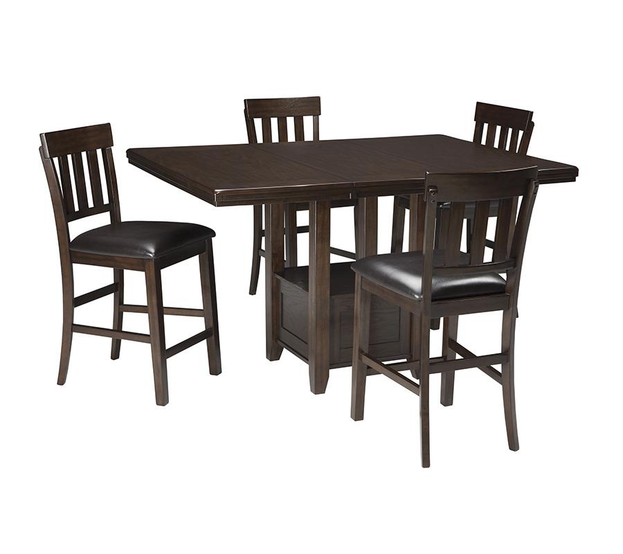 Modern sophistication, beautifully served. Haddigan counter height extension pub set raises the bar with a simply striking design and rich, dark finish. Removable leaf stretches the possibilities. Built-in shelf stacks up as additional storage space.