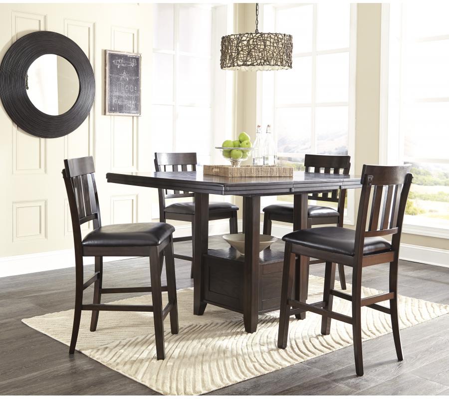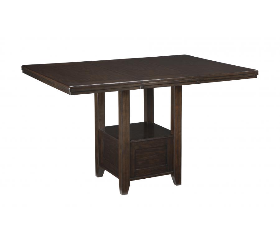 Modern sophistication, beautifully served. Haddigan counter height extension table raises the bar with a simply striking design and rich, dark finish. Removable leaf stretches the possibilities. Built-in shelf stacks up as additional storage space.
