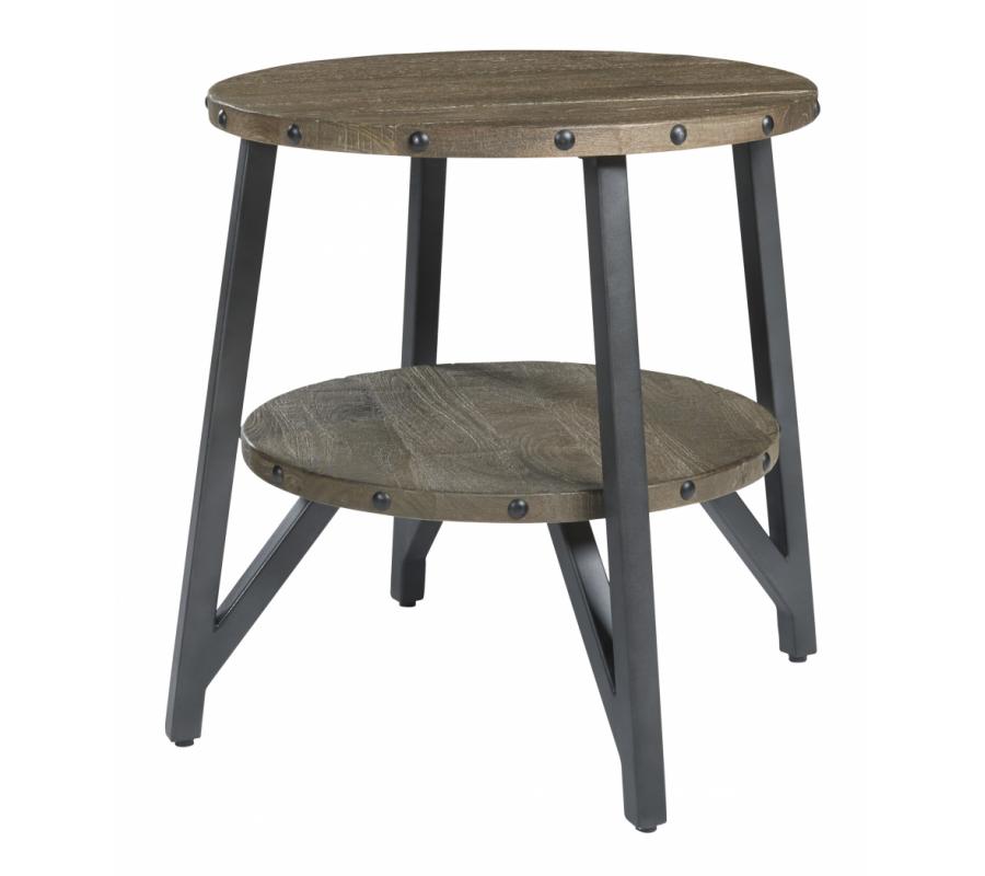 This round end table is a riveting example of urban casual design. The plank effect mango wood top and shelf are finished in a clear nutmeg color for a naturally beautiful effect. Striking cantilevered metal legs and rivet head accents tie the look together for a well-edited aesthetic.