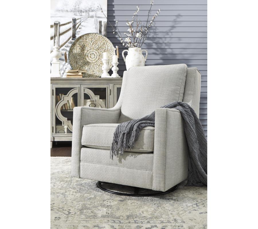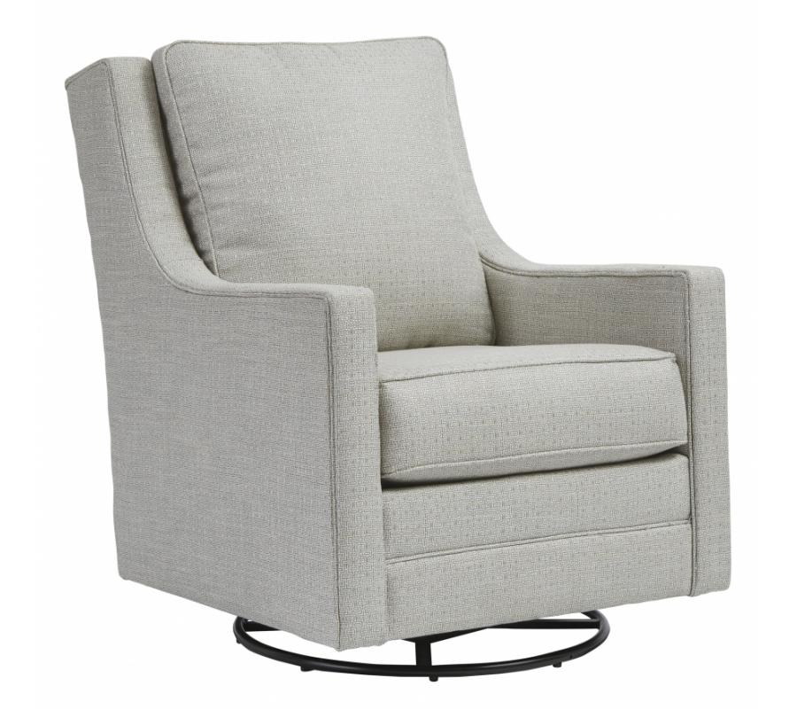 Crisp and cool—but not without its own curves, this accent chair lends a quiet confidence to your room. The subtle geometric pattern and slope arm design keep this grownup accent chair feeling youthful. Style features a Reversible Back Cushion and a swivel base with full 360 degree rotation.