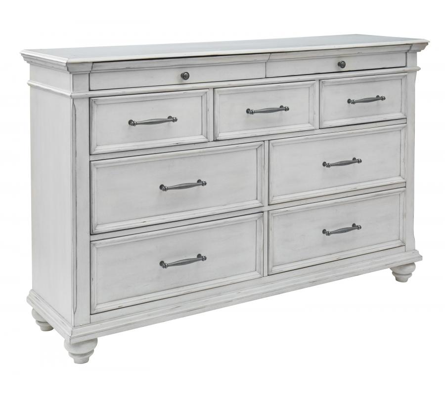 Give your retreat vintage charm and valuable drawer storage with this dresser. In a beautifully distressed whitewashed finish, you'll love putting it all away in casual style. Seven full-sized drawers and two accessory top drawers will easily accommodate your needs. Generously scaled moulding from top to bottom, along with bun feet and drawer handles with a transitional aesthetic, give this dresser character—invoking the feel of a quaint cottage escape.