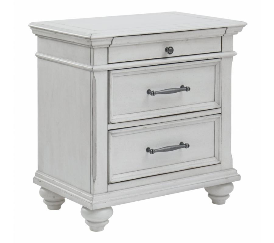 Give your retreat vintage charm and valuable bedside storage with this 3-drawer nightstand. In a beautifully distressed whitewashed finish, two drawers and a smaller top accessory drawer will help you keep bedtime essentials nearby in casual style. Generously scaled moulding from top to bottom, along with bun feet and drawer handles with a transitional aesthetic, give this nightstand character—invoking the feel of a quaint cottage escape.