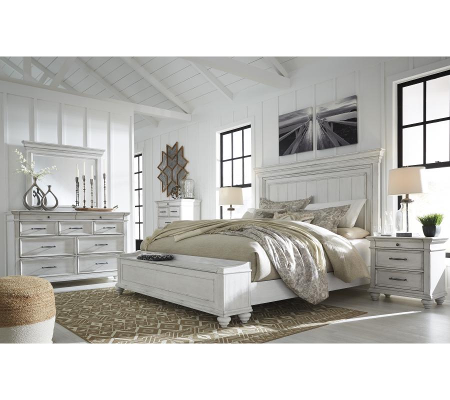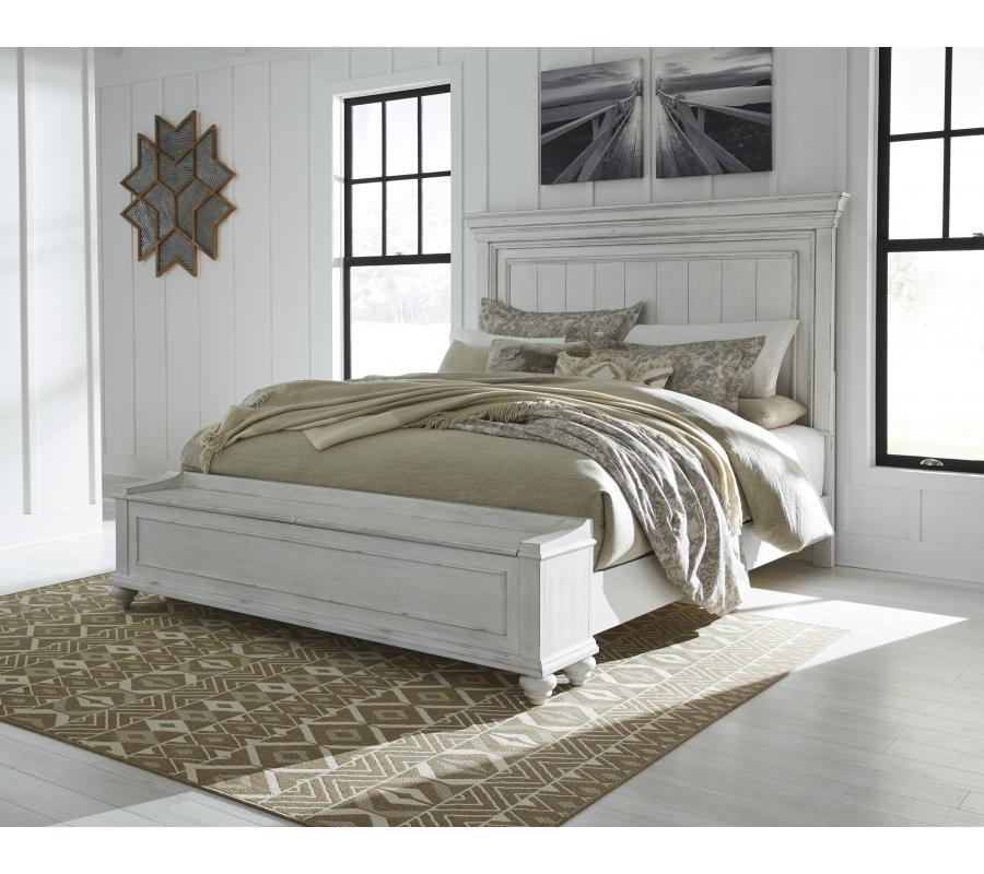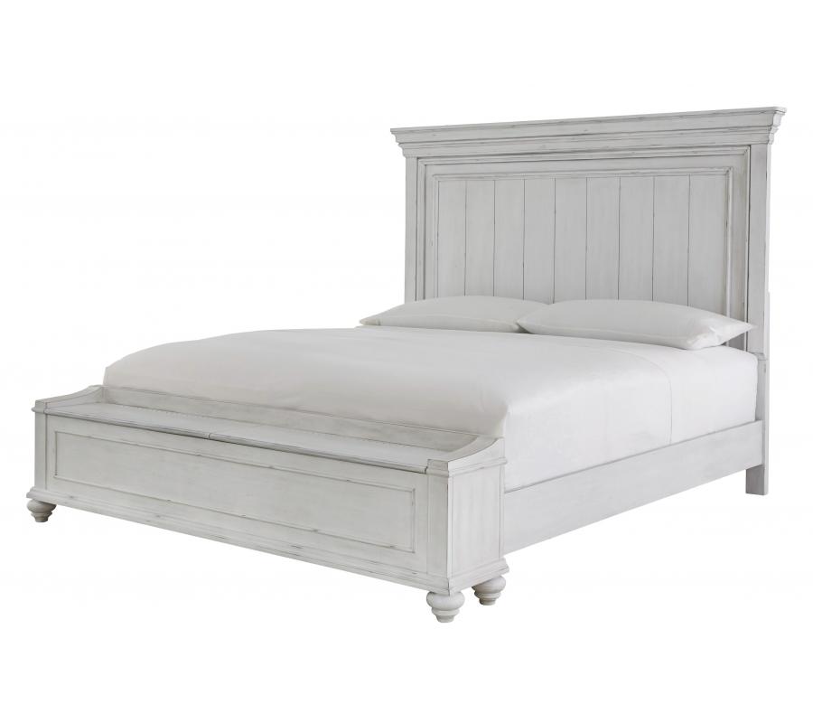 Give your retreat vintage charm with this beautifully distressed whitewashed finish bed. Generously scaled moulding from top to bottom, along with bun feet and storage located in the footboard adds character—invoking the feel of a quaint cottage escape.