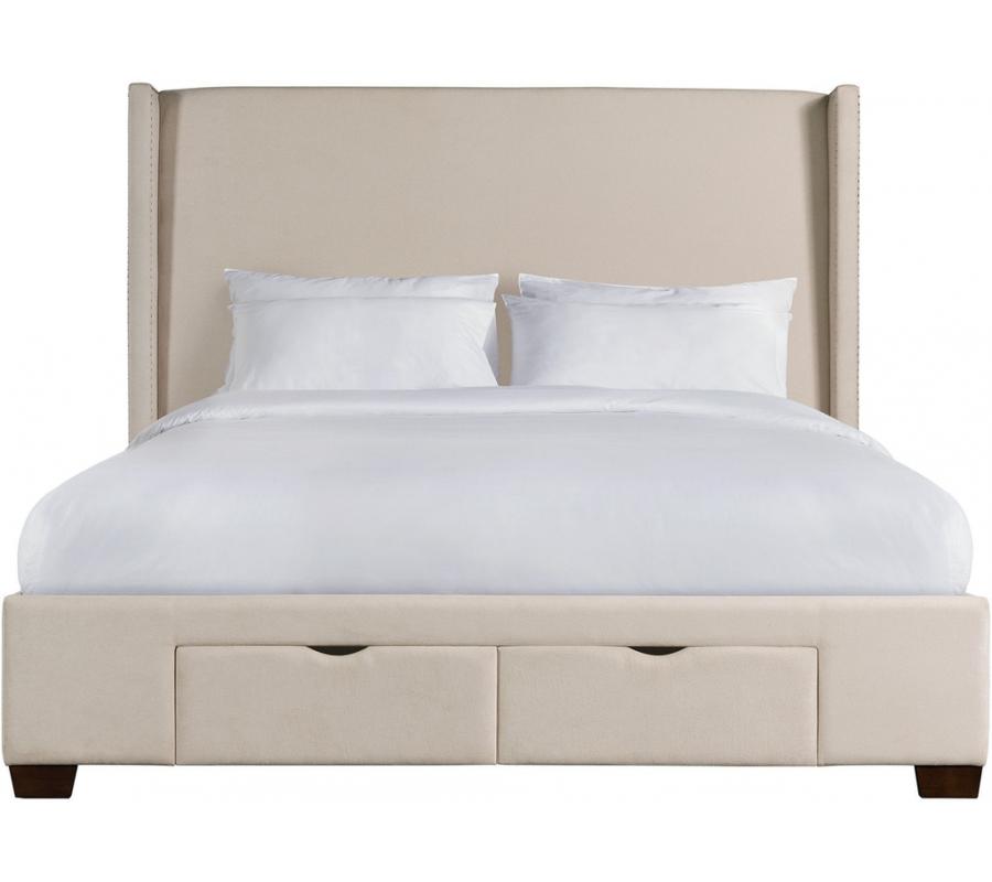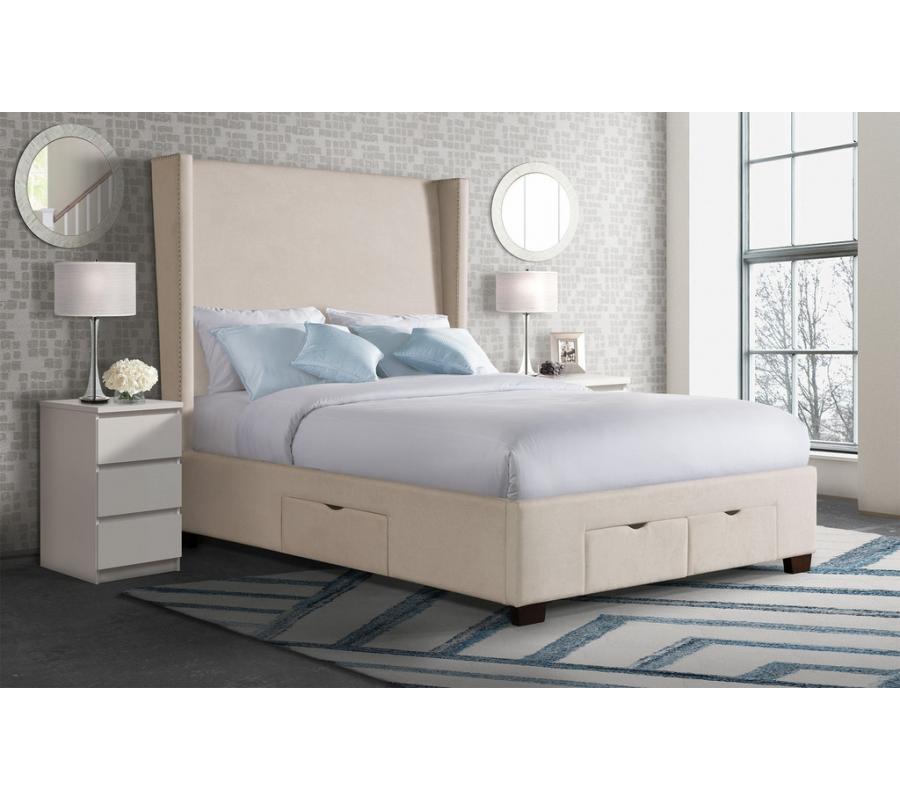 Make a bold statement with the Magnolia upholstered bed. The high profile, wingback headboard with nailhead trim is sure to be the center of attention in any bedroom. The low profile footboard, with simple wooden feet makes sure to not distract from the overstated headboard. The simple silhouette and neutral colors ensures that this piece fits in with many different interior styles.