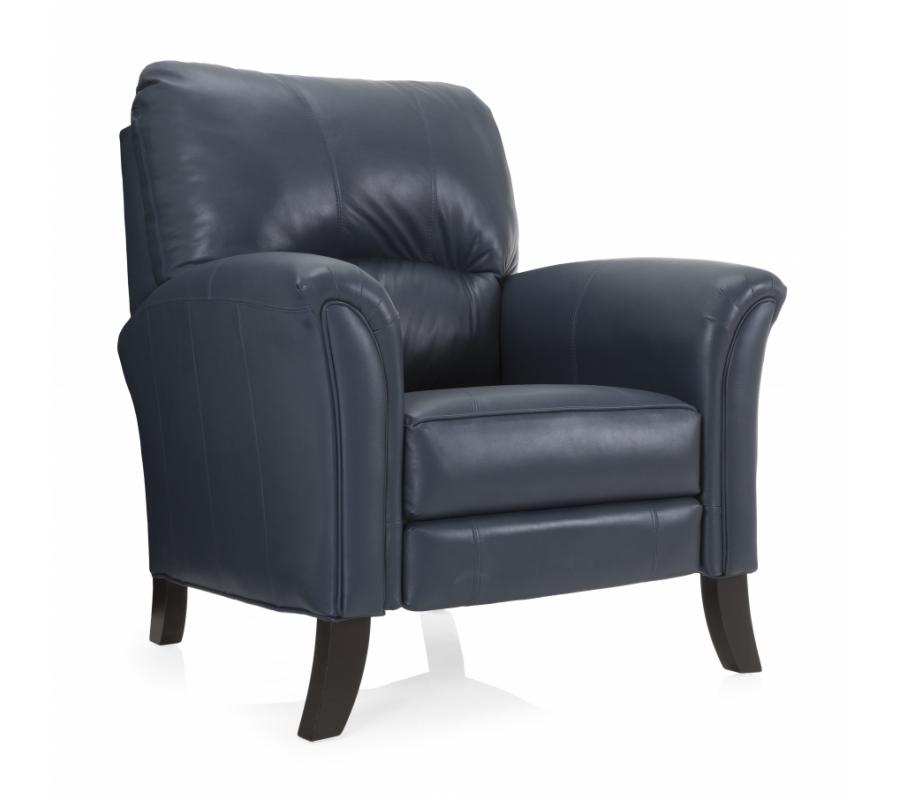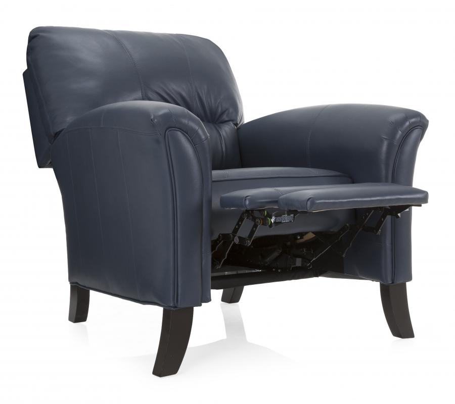 A case of contemporary and classic style influences coming together in a beautiful way, this leather push back recliner makes for a discreet recliner for any room. It features attached cushions, hidden footrest, accent stitching, and curved black legs that add a beautiful shape to this recliner. To recline with this piece just simply lean back, there are no handles to push or pull. Rather the foot rest is conveniently and covertly located underneath and extends out as the recliner is pushed back.