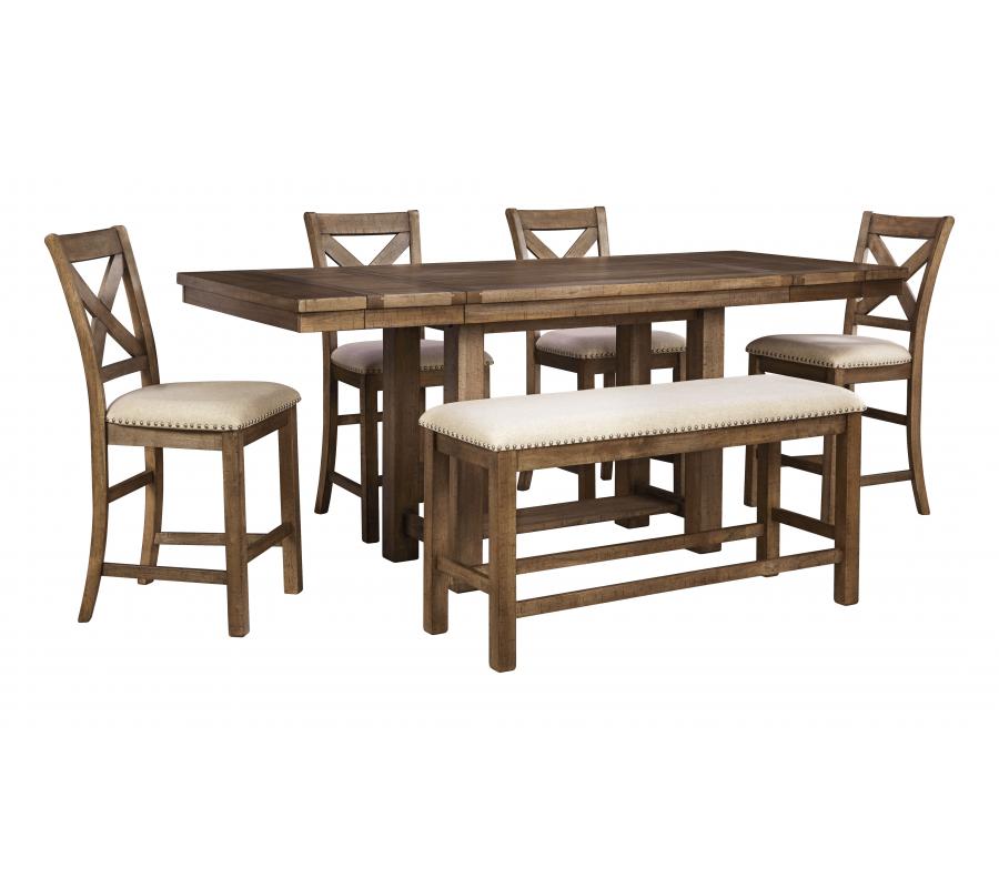 Moriville counter height dining table set might be simple at first sight, but a closer look reveals beauty in the details. From the through-tenon pedestal base to the plank-effect table top and distressed nutmeg finish, Moriville is beaming with charm. Small scale is especially suited to loft-style living, but two optional leaves ensure there’s plenty of space for parties up to eight.