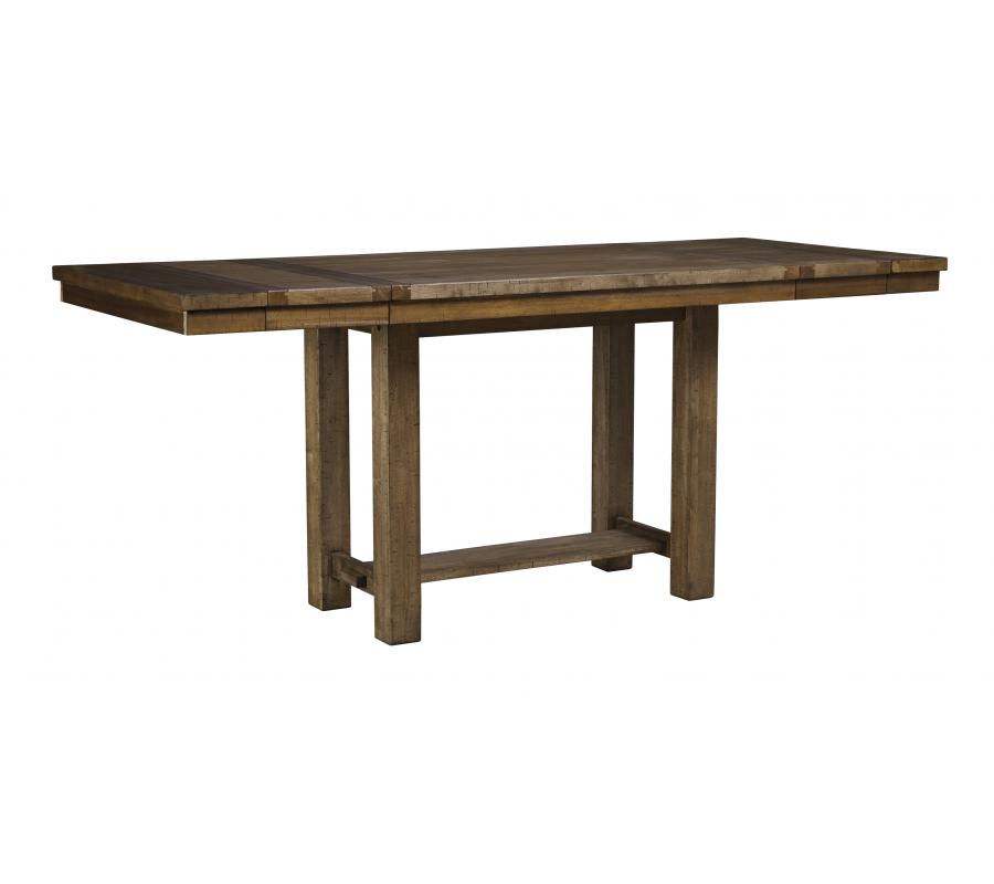 Moriville counter height dining table might be simple at first sight, but a closer look reveals beauty in the details. From the through-tenon pedestal base to the plank-effect table top and distressed nutmeg finish, Moriville is beaming with charm. Small scale is especially suited to loft-style living, but two optional leaves ensure there’s plenty of space for parties up to eight.