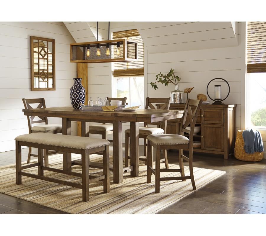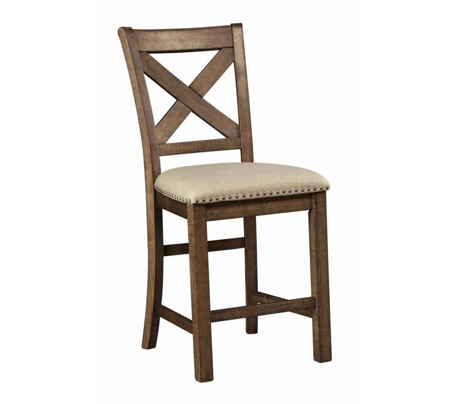 Moriville upholstered bar stool might be simple at first sight, but a closer look reveals beauty in the details. With a distressed nutmeg finish, antiqued nailhead trim and textured polyester upholstery, Moriville is beaming with charm. Cushioned seat ensures long, lingering meals are enjoyed in comfort.