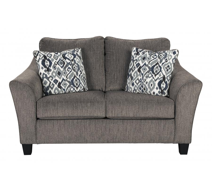 Nemoli loveseat sets the scene for a modern space full of casual flair. Its textured chenille with solid microfiber upholstery provides a luxuriously soft feel that’s inviting. Gently flared arms and plush seat cushions welcome comfort and relaxation. The on-trend slate-colored upholstery offers a perfect background for the two decorative pillows to pop with beauty.