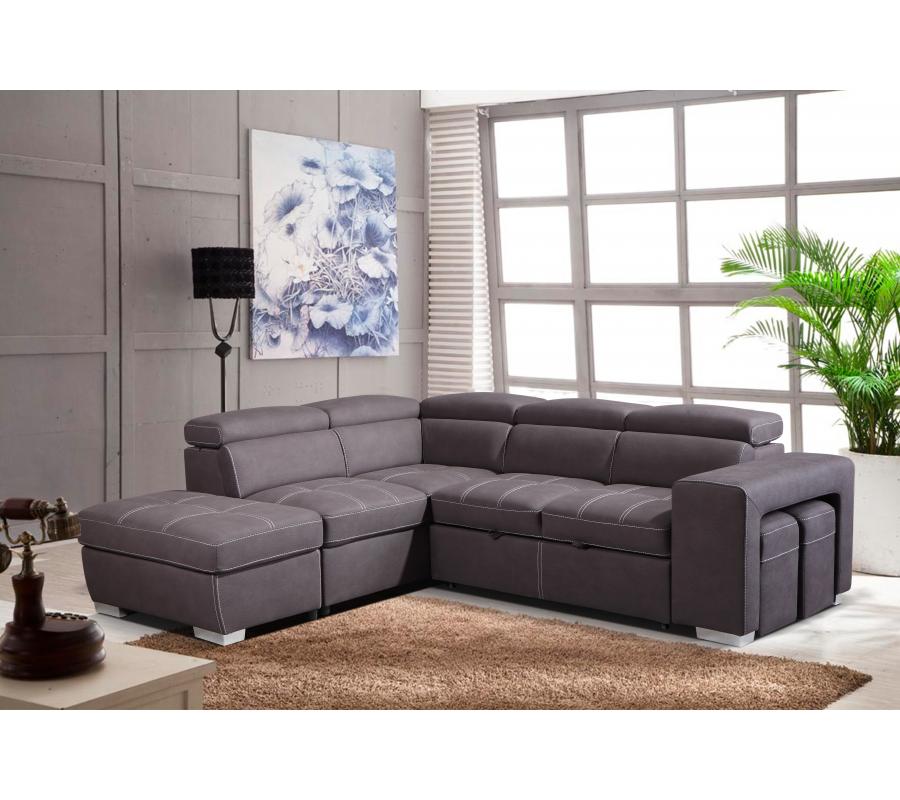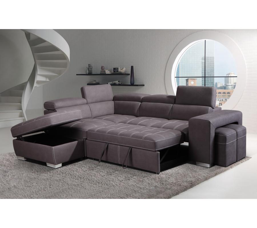 2 piece sectional chaise sofa that pulls out into a convenient sleeper with a matching storage ottoman. The sectional is covered with a durable fabric with contrast white stitching and chrome accent feet. Sofa has easy to use handles to pull out the pop up section to transform this sectional into the perfect spot for an overnight guest. Positano has easy to use pop up headrests. Convenient USB ports located on one side of the sofa for quick and easy charging of devices. Padded and movable matching storage ottoman that is spring operated for trouble free lifting.