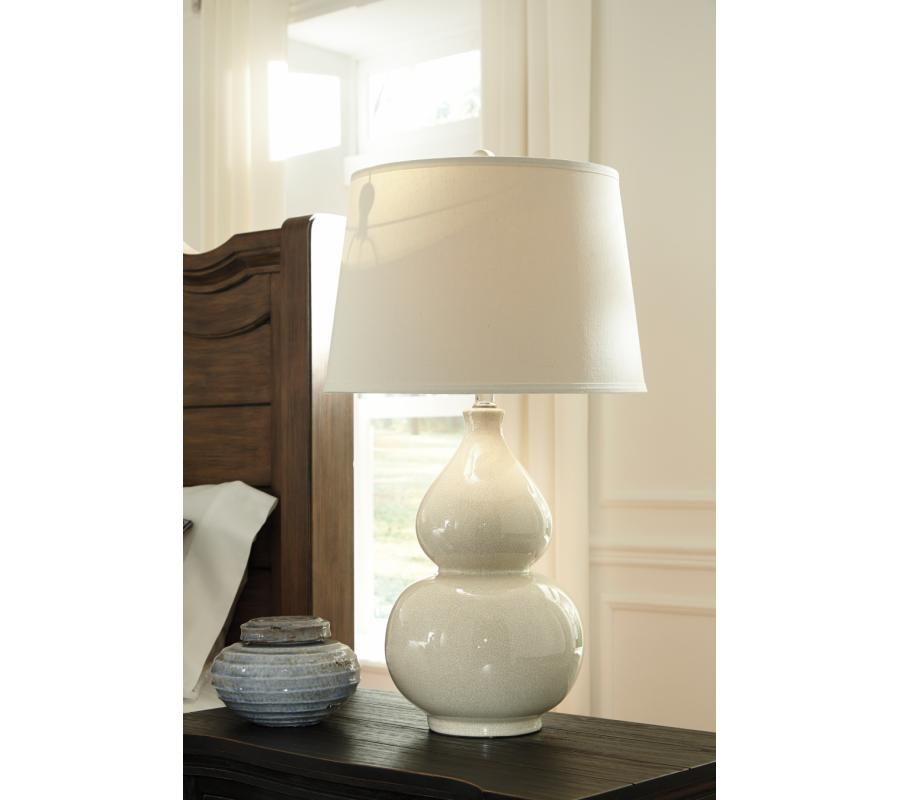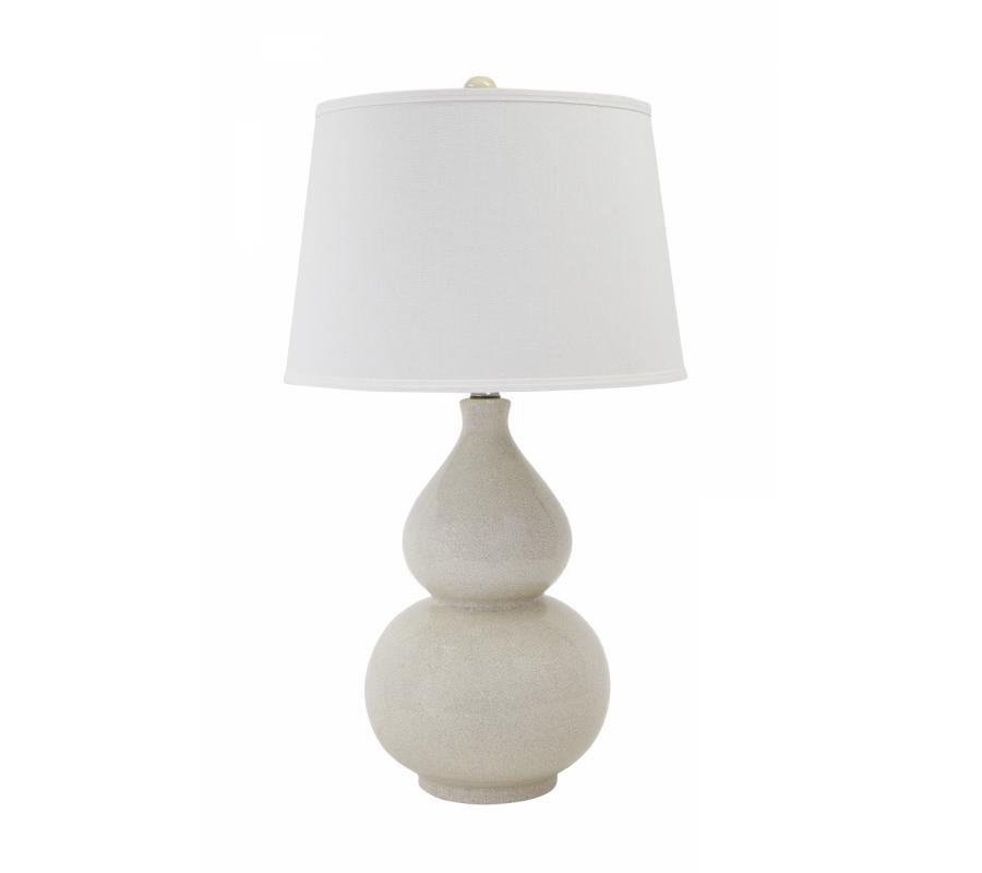 Turn onto a relaxed sense of elegance. Double gourd shaped base of the Saffi table lamp is simply gorgeous. Crackle glaze adds a rich layer of interest to the ceramic surface.