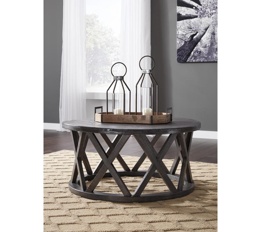 Make it bold and beautiful when you round up the rustic style of this coffee table. You'll love the casual look that's delivered through its transitional design. A drum shape with repeated "X" motifs form a unique base and the round top has a planking effect full of detail in a weathered finish. Saw kerf detailing adds notable character to each of the "X" motifs in the table's base—what a plus for creating a relaxed, rustic setting in your living area.