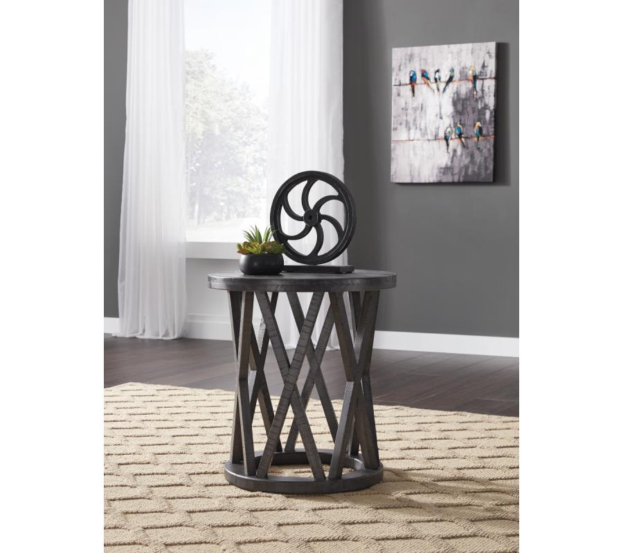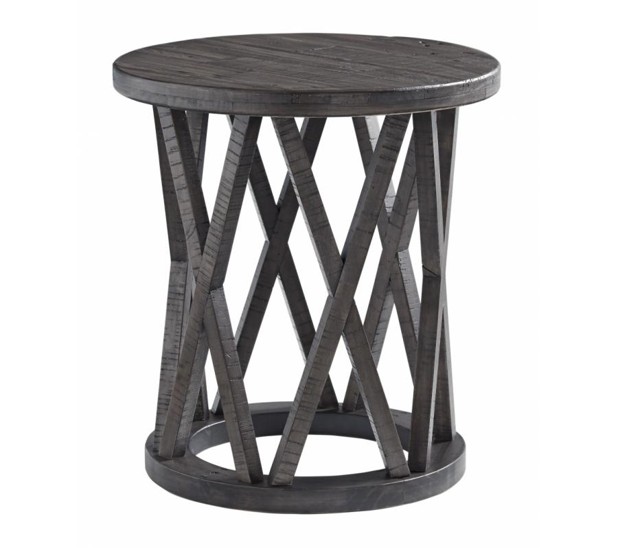 Make it bold and beautiful when you round up the rustic style of this end table. You'll love the casual look that's delivered through its transitional design. A drum shape with repeated "X" motifs form a unique base and the round top has a planking effect full of detail in a weathered finish. Saw kerf detailing adds notable character to each of the "X" motifs in the table's base—what a plus for creating a relaxed, rustic setting in your living area.