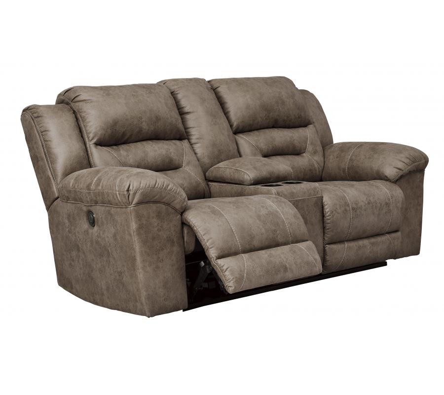 For those that love the cool look of leather but long for the warm feel of fabric, this power reclining loveseat with console delivers both with ease. Its high-performance padded faux leather is remarkably durable and easy to clean, just the thing for family spaces. When it’s time to relax, the one-touch power control puts the perfect position at your fingertips. Channel-stitched back cushions provide indulgent lumbar support for maximum seating comfort—not to mention fashion-forward flair.