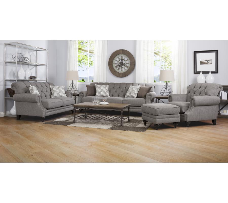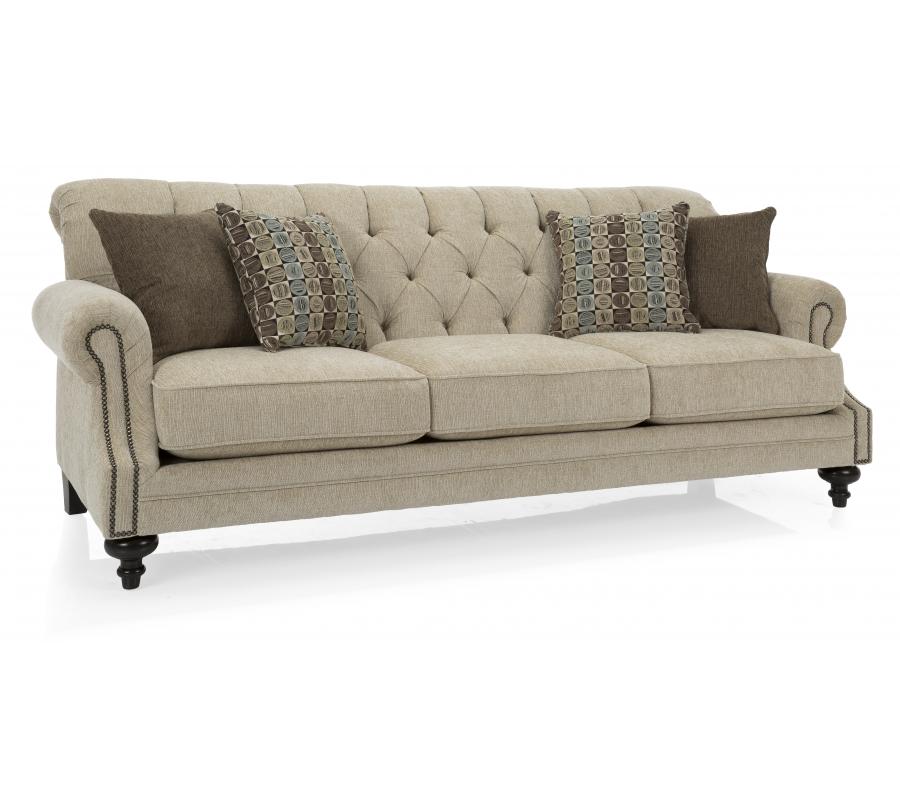 A case of contemporary and classic style influences coming together in a beautiful way, this creamy tan sofa brings a classic look to your living room. It features attached seamless back cushions with buttons, loose seat cushions, and decorative arm rests with accent nailheads which adds a sharp look to this piece.