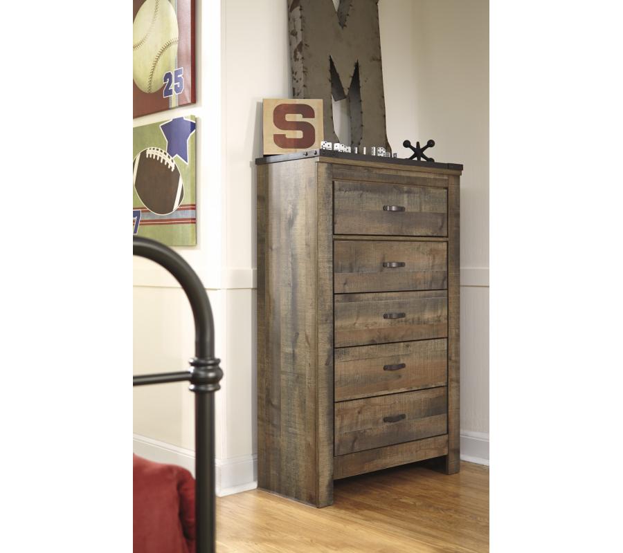 Whether she loves horses or he's a cowboy at heart, Trinell chest of drawers matches their authenticity. Rustic finish, plank-style details and nailhead trim pay homage to reclaimed barn wood, making for a chic look loaded with charm. Five roomy drawers keep clothing or toys nicely reined in.